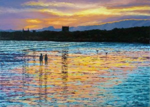 Le Dossen is een plaatsje aan de kust in het noord-westen van Finistère, Bretagne. Het eilandje bij Le Dossen kun je bij laag water te voet en zelfs met de auto bereiken. Er staan 2 bewoonbare huizen en 2 ruïnes. Wandelend over het strand in de avonduren waren hier regelmatig mooie zonsondergangen te bewonderen. Ter plekke een schets gemaakt en een paar foto’s en op een plek vlakbij uitgewerkt op het paneel. Eerst heb ik een schets gemaakt in bruintinten met pastelkrijt. Daarna de schets als onderschildering met acrylverf op het paneel vastgelegd. De olieverf is vervolgens met schildersmessen opgebracht.