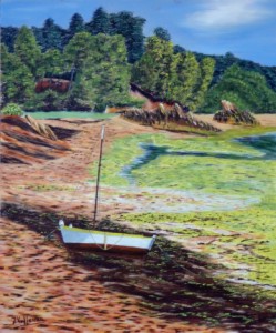 De Lezardieux heeft mooie oevers, die met een middagzonnetje bij laag tij een prachtig kleurenspel laten zien. Drie dagen hier kunnen schilderen zonder regen. Daarna moest ik een tent opzetten om verder te kunnen schilderen. Om de juiste lichtaccenten aan te kunnen brengen brak gelukkig na twee dagen regen de zon nog door. Eerst heb ik een schets gemaakt in bruintinten met pastelkrijt. Daarna de schets als onderschildering met acrylverf op het paneel vastgelegd. De olieverf is vervolgens met penseel opgebracht.