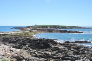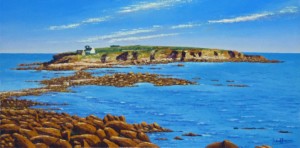 Raguenez is een eilandje voor de kust van Zuid-Finistère in de buurt van pointe de Trevignon. Bij laag water kun je het te voet bereiken. De vorm en ligging maken van het eiland op zich al een plaatje om geschilderd te worden. Toen ik het zo zag liggen in het avondzonnetje, was ik meteen verkocht. Foto’s en een compositieschets gemaakt en de andere dagen op een locatie vlakbij verder uitgewerkt. Eerst heb ik een schets gemaakt in bruintinten met pastelkrijt. Daarna de schets als onderschildering met acrylverf op het paneel vastgelegd. De olieverf is vervolgens met schildersmessen opgebracht.