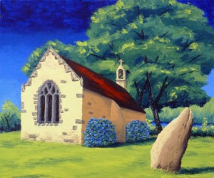 Niet alleen de kust van Bretagne is schilderachtig. In het binnenland kom je vele oude kapelletjes tegen, vaak vergezeld van de voor Bretagne zo kenmerkende hortensia’s. Daarnaast de rust die er vanuit gaat, maakt dat het heel goed voelt om er zo nu en dan eentje te schilderen. Ook dit kapelletje was zeer rustig gelegen, zodat ik er een week lang dagelijks kon werken. Gelukkig zat het weer me mee. Het schilderij is in een wat grove impressionistische stijl opgezet. Eerst een schets in bruintinten gemaakt met pastelkrijt en vervolgens de schets op het paneel als onderschildering vastgelegd met acrylverf. De olieverf is daarna met schildersmessen opgebracht.