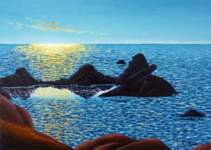 Port Guez is een gehucht vlak bij Plouescat. Ik verbleef daar twee weken in een huisje direct aan de kust. Voor Bretagne ongekend, was het daar de hele tijd mooi weer met weinig wind. Bijna elke avond was de ondergaande zon te bewonderen. Ik kon het niet laten vanuit de tuin bij het huisje dit schilderij te maken. Eerst heb ik een schets gemaakt in bruintinten met pastelkrijt. Daarna de schets als onderschildering met acrylverf op het paneel vastgelegd. De olieverf is vervolgens met schildersmessen opgebracht.