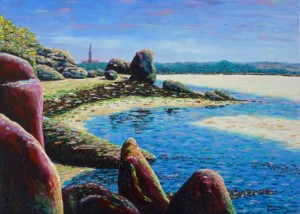 Vanuit Port Guez de kuststrook langs wandelend, kwam ik op een plek dat mij een mooi zicht op Plouescat bood. Voor Plouescat ligt een uitgestrekte zandvlakte, die bij eb grotendeels droogvalt. Het uitzicht inspireerde mij om in impressionistische stijl een schilderij ervan te maken. Omdat het mooie weer meerdere weken aanbleef, kon ik op locatie het schilderij opzetten en afronden. Eerst heb ik een schets gemaakt in bruintinten met pastelkrijt. Daarna de schets als onderschildering met acrylverf op het paneel vastgelegd. De olieverf is vervolgens met schildersmessen opgebracht.