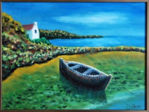 Het zuiden van Bretagne kent vele rustige stukjes, met zo nu en dan een kenmerkend wit huisje met rood of zwart dak. Een boot om bij hoog water uit te varen om vis te vangen ligt dan vlak bij. Dit schilderij is één van mijn eerste werken van de kust van Bretagne. Na een compositietekening is dit schilderij direct op doek aangebracht met penselen.