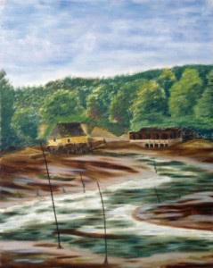 Bretagne kent nog 2 echte oude getijde molens die in werking zijn. Le Moulin du Hénan is er één van, schitterend gelegen aan de l’Aven bij Pont Aven. Gaugin en zijn tijdgenoten hebben hier veel schilderijen gemaakt en de molen ontbreekt niet als onderwerp. In afwijking van de impressionisten heb ik een positie gekozen bij laag water, ongeveer een meter onder hoogwaterniveau. Betekende wel dat je ruim voordat het hoog water werd van de locatie weg moest. Na een schets gemaakt te hebben, heb ik de olieverf direct met penselen op het doek aangebracht.