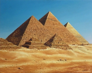 Mijn laatste opdracht betrof een groot doek van 80 x 100 cm over de piramides van Egypte. Doel was het imposante van de piramides tot uitdrukking te laten komen. Ten behoeve van de opdracht heb ik twee visies uitgewerkt. Onderstaand de beide eindresultaten. Beide schilderijen zijn voor duizend Euro verkocht.
